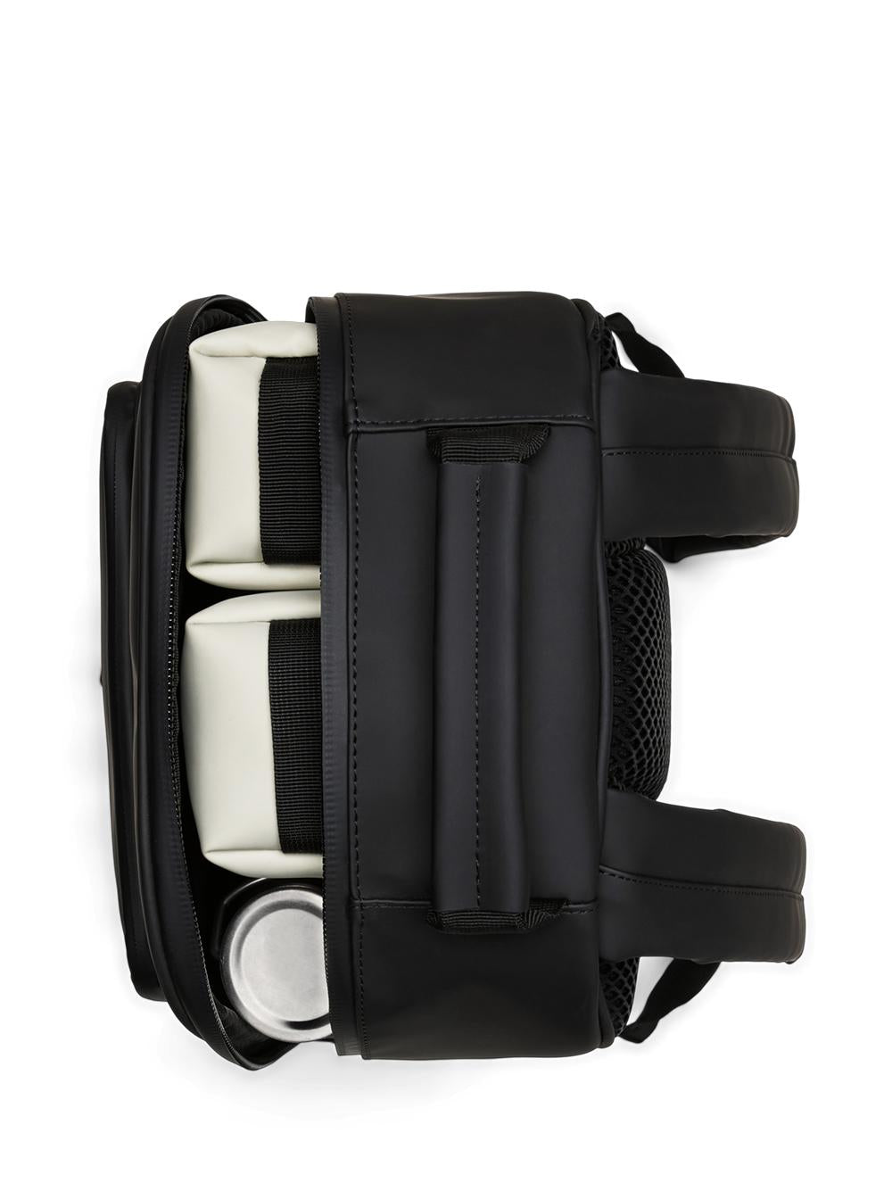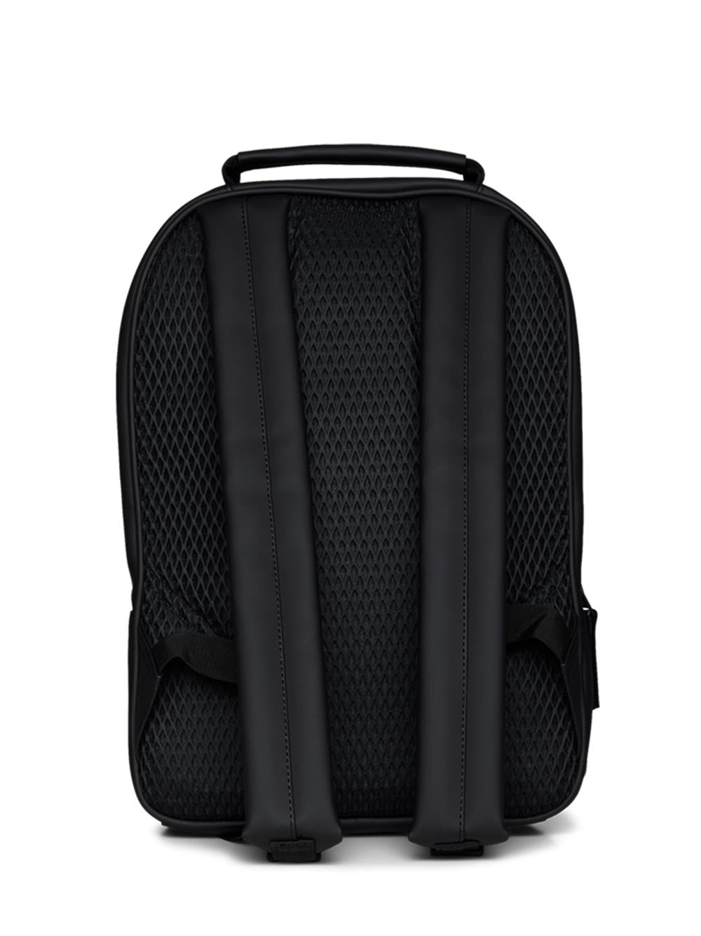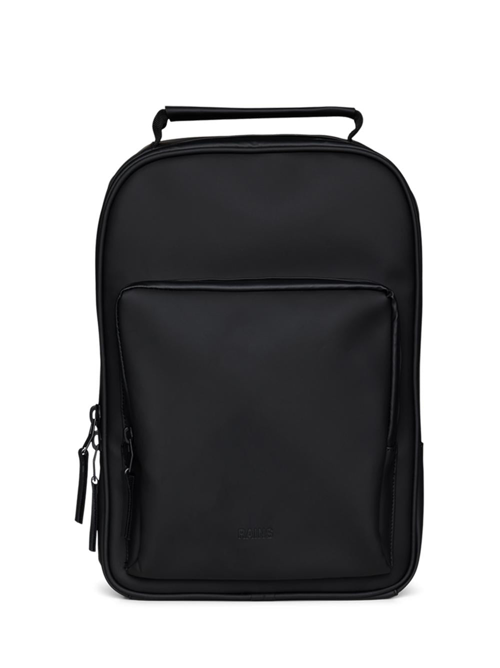 Book Daypack da Rains: zaino di colore nero, chiusura con zip, tasca anteriore con zip, scomparto per laptop fino a 15 pollici, manico di trasporto e pannello posteriore imbottito.