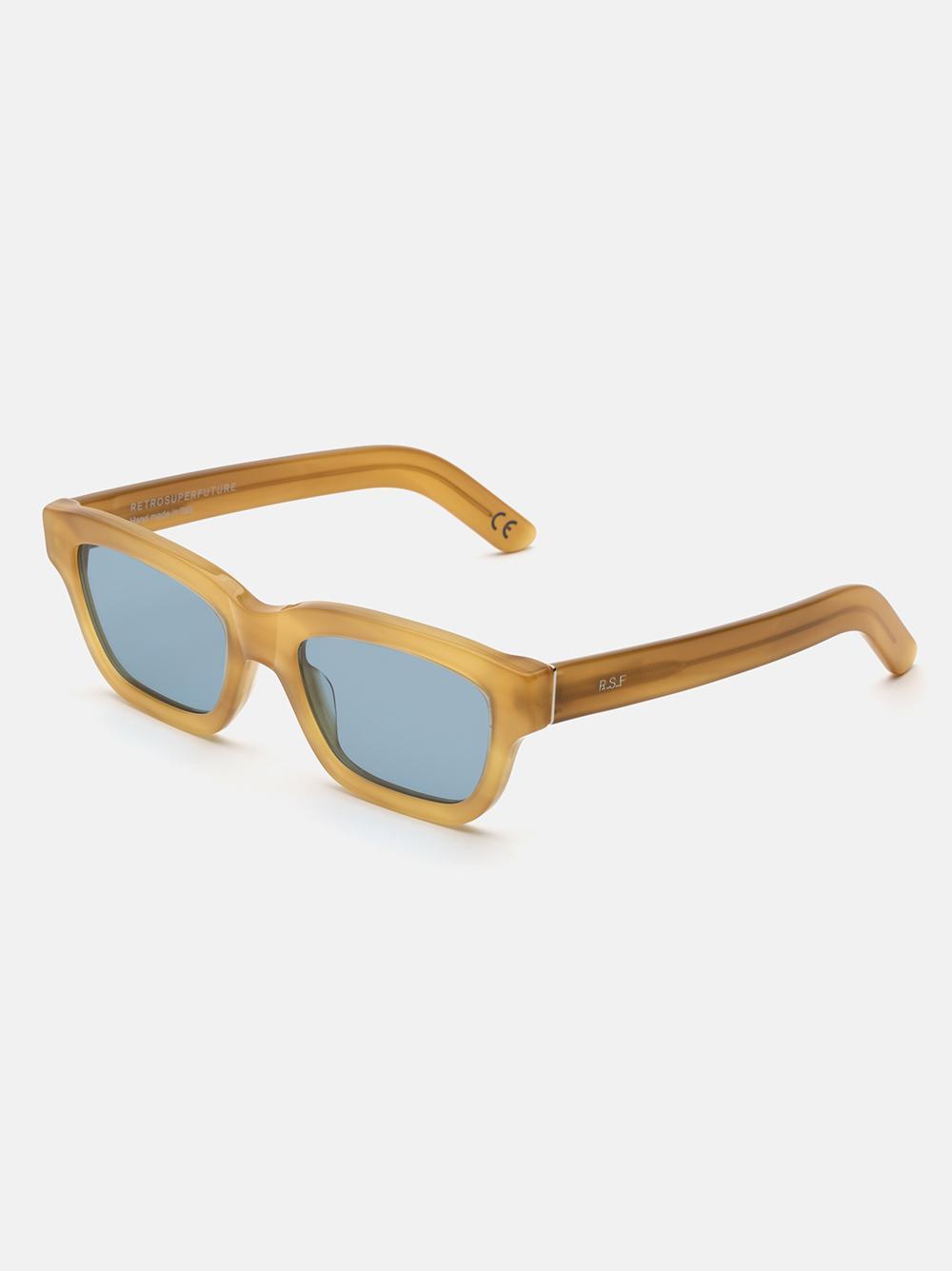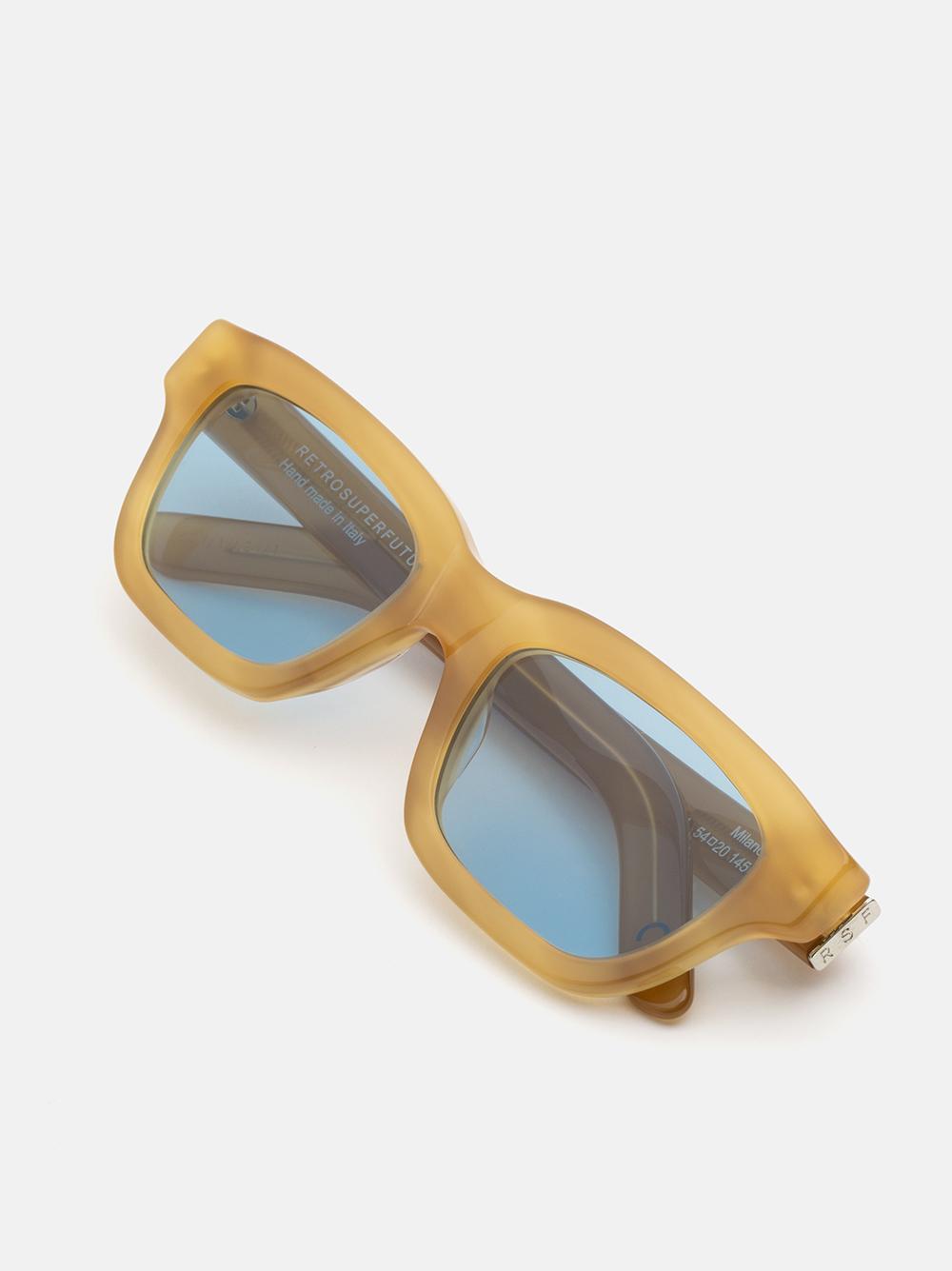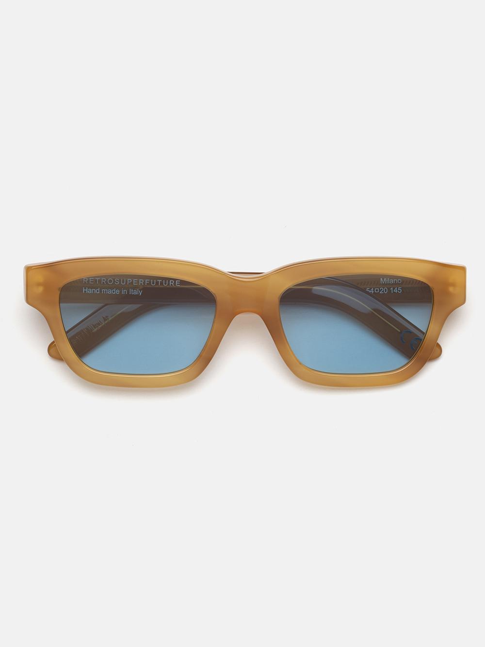 Milano Bagutta da Retrosuperfuture: RSF è profondamente radicata nel patrimonio della moda milanese e ne celebra la ricca storia, offrendo al contempo una nuova interpretazione dell'estetica contemporanea. Omaggio alla città e al suo stile, Milano è concepito come una versione più bassa e snella delle classiche montature squadrate. Il suo profilo basso conferisce un carattere deciso alla montatura, mentre l'arco superiore leggermente curvo aggiunge un tocco distintivo per uno stile essenziale e una calzata confortevole. Questa versione è disponibile in acetato caramello chiaro con lenti blu colorate.
