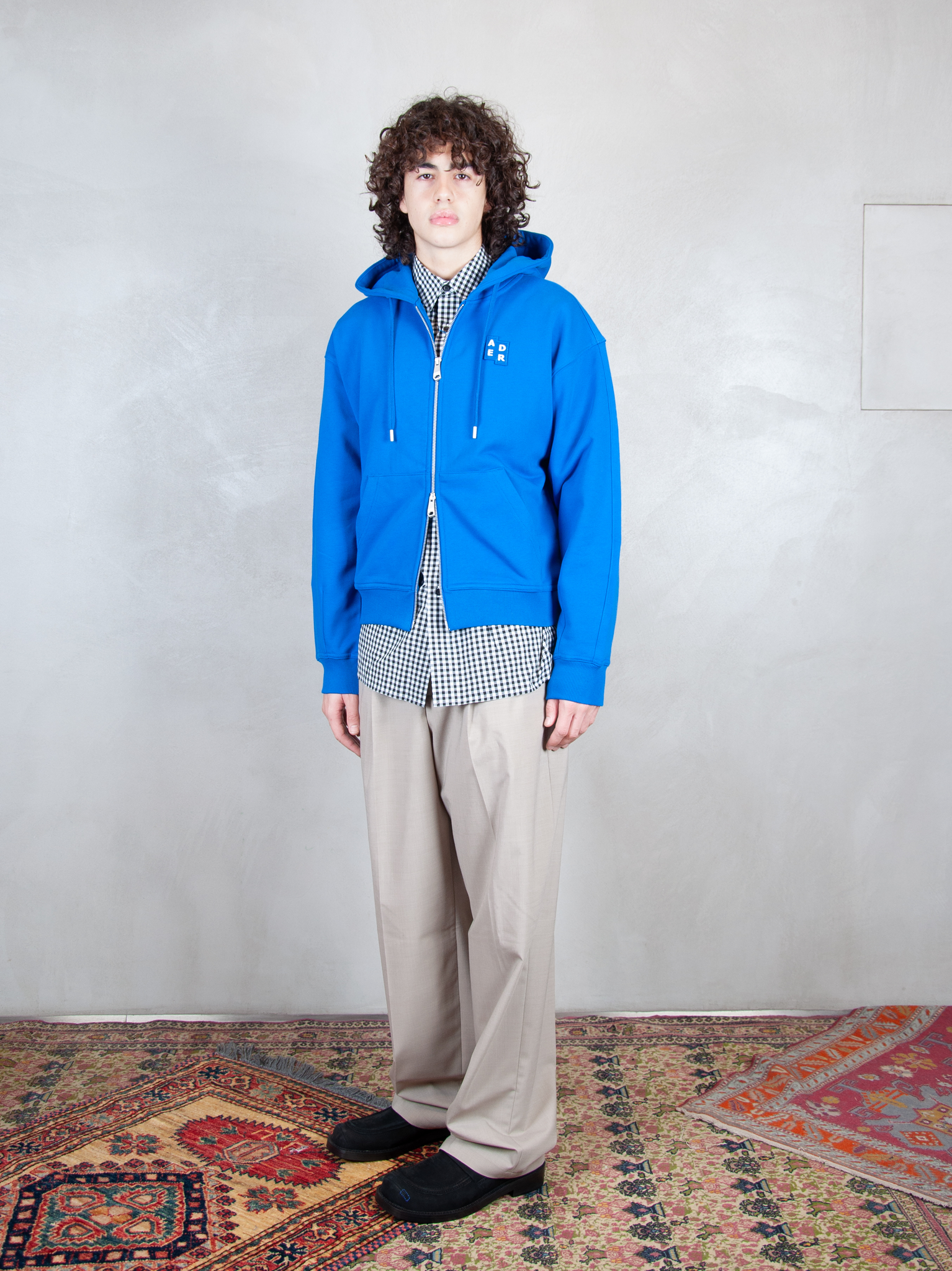 Semi Oversized Zipped Hoodie da Ader Error: felpa di colore azzurro, cappuccio regolabile, chiusura con zip, applicazione logo sul petto, dettagli a contrasto, orlo e polsini a coste.